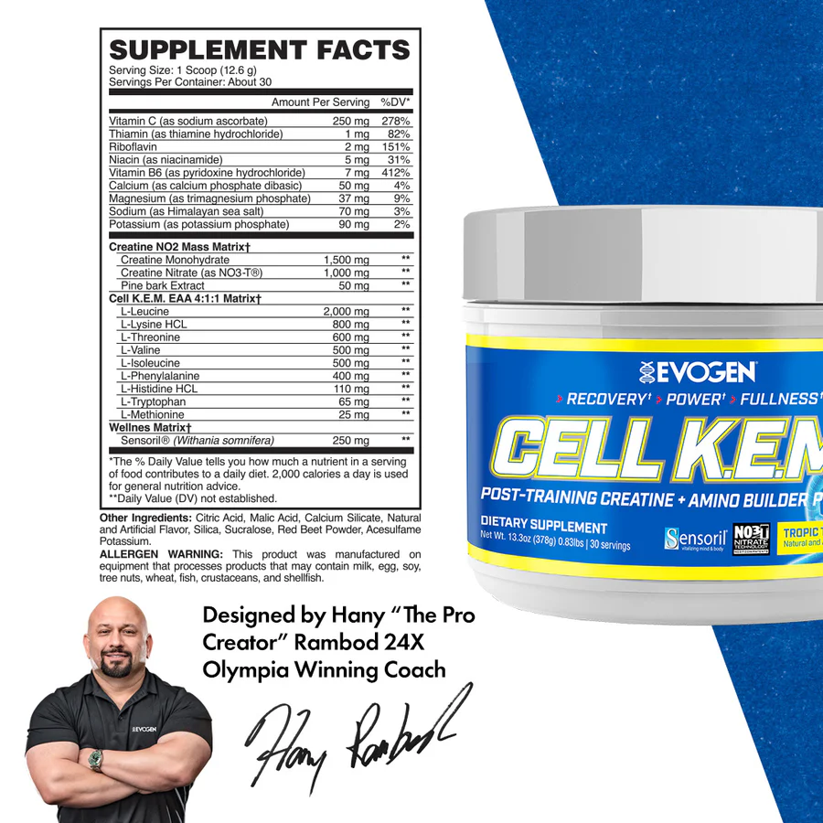 4,900,000تومان 5,500,000تومانCell K.E.M. PR (Pure Recovery) جدیدترین مکمل ریکاوری برند آمریکایی Evogen Nutrition است که برای افزایش سرعت بازسازی عضلات، بهبود پمپ، افزایش حجم سلولی و حمایت از رشد عضلانی طراحی شده است. این محصول با ترکیب منحصربهفرد BCAA با نسبت 4:1:1، آمینواسیدهای ضروری (EAA)، کراتین نیترات (NO3T®)، بتائین، گلیسرول و عصارههای گیاهی ثبتشده، بهترین انتخاب برای ریکاوری حرفهای بعد از تمرین است.